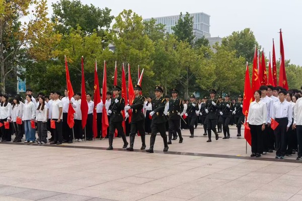 上午7时整,伴随着庄严的国歌声,五星红旗冉冉升起。全体成员着装整齐、精神饱满,面向国旗肃立致敬。随后,2025级新生代表进行了国旗下讲话,向为民族独立和人民解放作出卓越贡献的先辈们致以崇高敬意。升旗结束后,全体参与人员齐声合唱《我和我的祖国》,用激昂的歌声表达对祖国的无限热爱与祝福。