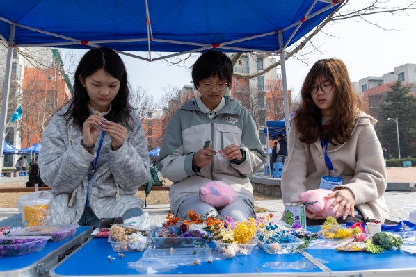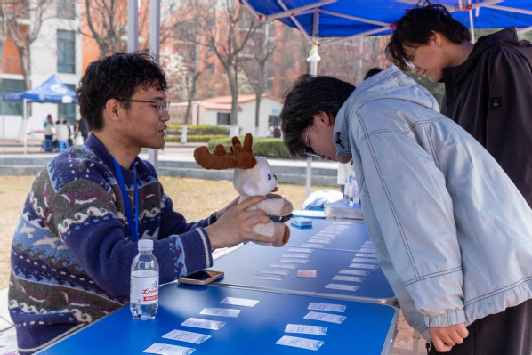 而最受追捧的风铃手工体验区更是排起了长队。参与者们领取空白吊片、彩绳、小铃铛等材料,结合谷雨节气的美好期许,在卡片上写下对自己的鼓励、对未来的祝愿或是心理健康暖心话语,在一笔一画中舒缓情绪、沉淀心绪。随后,大家按照简易步骤将吊片、彩绳与铃铛组装成专属风铃,每一串风铃都承载着独特的心意与期许。完成制作后,同学们将风铃悬挂在活动现场的许愿架上,微风拂过,清脆铃声此起彼伏,与春日绿意相映成趣,成为荟萃广场上一道灵动治愈的风景线。不少同学驻足拍照,分享这份春日里的小确幸,现场欢声笑语不断。